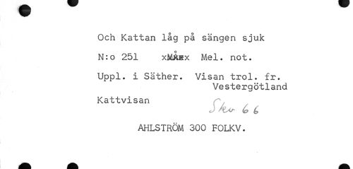 //// Och Kattan låg på sängen sjuk //// N:o 251 xMÅkx Mel. not. //// Uppl. i Säther. Visan trol. fr. //// Vestergötland //// Kattvisan //// J fco* Q //// AHLSTRÖM 300 FOLKV. ////