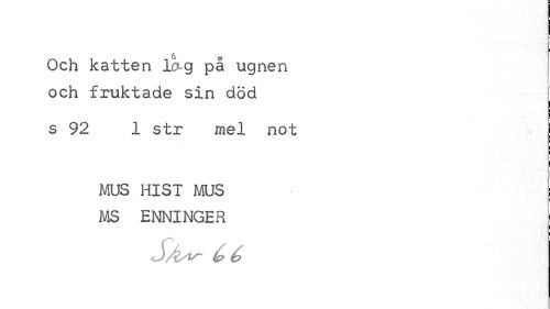 //// I //// Och katten lo-g på ugnen och fruktade sin död //// ; //// s 92 1 str mel not ! //// MUS HIST MUS //// MS ENNINGER j ////