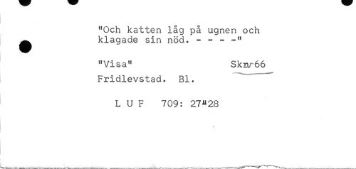 //// "Och katten låg på ugnen och ^ klagade sin nöd. - - - -" //// "Visa" Sk:ar66 //// Fridlevstad. Bl. //// L U F 709: 27*28 //// . -- -- - ___. ___ . w. A-.WVN-^w'^-»»-^ . t - _ ... ////