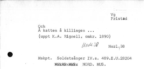 //// v. ¦ //// vg //// Fristad //// 9ch //// A katten å killingen ... (uppt K.A. Rignell, omkr. 1890) //// [HfuU tf Nori. 38 //// r //// 4 //// Mskpt. Soldatsånger IV.s. 489.E.U.28204 //// M&fcRQxMWSx NORD. MUS. ////