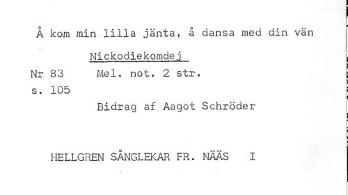 //// I //// o 1 //// A kom min lilla jänta, å dansa med din vän //// -v < //// Nickodiekomdej i //// i i //// Nr 83 Mel. not. 2 str. //// s. 105 : //// i i //// Bidrag af Aagot Schröder //// t //// HELLGREN SÅNGLEKAR FR. NÄÄS I ////