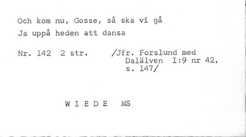 //// Och kom nu, Gosse, så ska vi gå Ja uppå heden att dansa //// Nr. 142 2 str. /Jfr. Forslund med //// Dalälven 1:9 nr 42, s. 147/ //// W I E D E MS ////