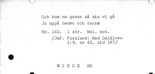 //// Och kom nu gosse så ska vi gå Ja uppå heden och dansa //// » //// Nr. 142. 1 str. Mel. not. //// v //// /Jmf. Forslund: Med Dalälven //// 1:9, nr 42, sid 147/ //// W I E D E MS ////