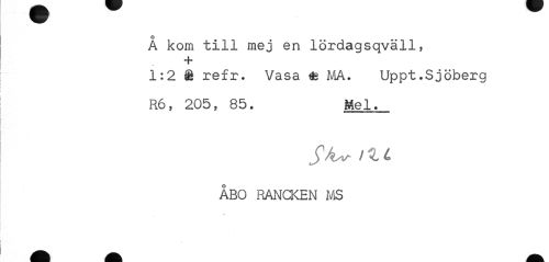 //// Å kom till mej en lördagsqväll, + //// 1:2 é refr. Vasa & MA. Uppt.Sjöberg R6, 205, 85. Mel. //// Sk^r 1ZC //// ÅBO RANCKEN MS ////