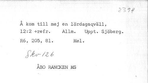 //// Å kom till mej en lördagsqväll, 12:2 +refr. Allm. Uppt. Sjöberg. //// R6, 205, 81. Mel. //// ÅBO RANCKEN MS //// i I //// 3 ////