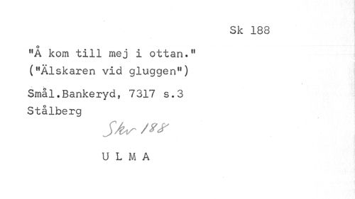 //// % //// Sk 188 //// "Å kom till mej i ottan.11 ("Älskaren vid gluggen") //// \ //// s. # • . //// Smål.Bankeryd, 7317 s.3 Stålberg //// Skir //// U L M A ////