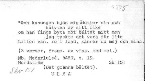 //// 0 i //// nQch konungen bjöd mig adotter sin och //// hälvten av sitt rike om han finge byta mot bältet mitt men //// jag tyckte det vara för lite Lillen vän, ro i land, känner du mej och mina. //// (3 verser, fragm. av visa. med mel.) //// Nb. Nederluleå, 5480, s. 19. Nordström Sk 151 //// rÅ / ~/ (Det granna bältet). //// / u L M A ////