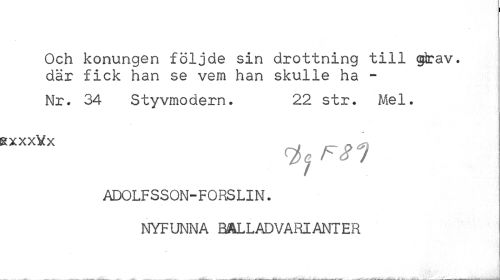 //// Och konungen följde sin drottning till girav. där fick han se vem han skulle ha - //// Nr. 34 Styvmodern. 22 str. Mel. //// ixxxYx //// Fsn //// ADOLFSSON-FORSLIN. //// NYFUNNA BALLADVARIANTER ////