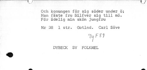 //// Och konungen för sig söder under ö; Han fäste fru Silfver sig till mö. För ädelig min skön jungfru //// Nr 38 1 str. Gotlnd. Carl Säve //// Dc,FW //// DYBECK SV FOLKMEL ////