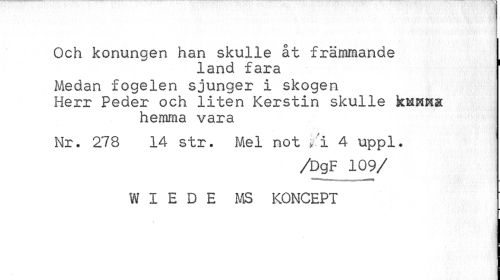 //// Och konungen han skulle åt främmande //// land fara //// Medan fogelen sjunger i skogen Herr Peder och liten Kerstin skulle kMKfts //// hemma vara //// Nr. 278 14 str. Mel not * i 4 uppl. //// /DgF 109/ //// W I E D E MS KONCEPT //// ¦ ////