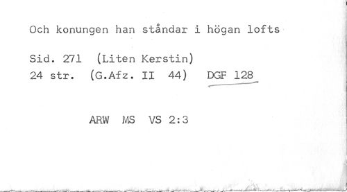 //// I //// Och konungen han ståndar i högan lofts //// ..a //// Sid. 271 (Liten Kerstin) //// 24 str. (G.Afz. II 44) DGF 128 //// ARW MS VS 2:3 //// ¦ | //// ¦ //// 1 //// fl //// * ^ ////