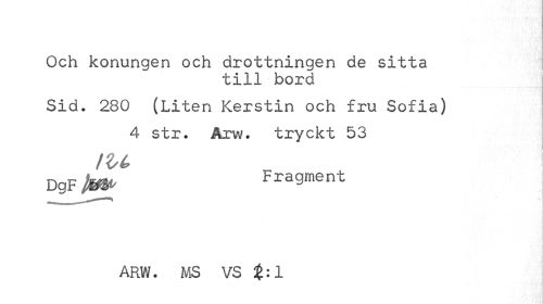 //// Och konungen och drottningen de sitta //// till bord //// Sid. 280 (Liten Kerstin och fru Sofia) //// 4 str. Arw. tryckt 53 //// DgFM' Fragment //// ARW. MS VS ////