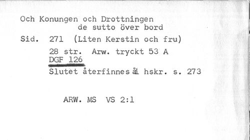 //// Och Konungen och Drottningen //// de sutto över bord //// Sid. 271 (Liten Kerstin och fru) //// 28 str. Arw. tryckt 53 A DGF 126 //// Slutet återfinnes ål hskr. s. 273 ARW. MS VS 2:1 //// i ////