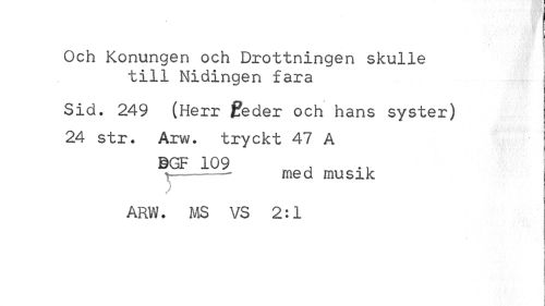 //// Och Konungen och Drottningen skulle //// till Nidingen fara //// Sid. 249 (Herr £?eder och hans syster) //// 24 str. Arw. tryckt 47 A //// BGF 109 , • i //// med musrk //// ARW. MS VS 2:1 ////