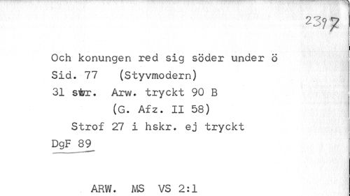//// 23? J? //// * //// Och konungen red sig söder under ö Sid. 77 (Styvmodern) 31 stor. Arw. tryckt 90 B //// (G. Afz. II 58) Strof 27 i hskr. ej tryckt DgF 89 //// ARW. MS VS 2:1 //// c ////