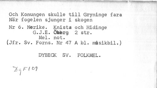 //// i //// é . Ä 'jfjijt*Q //// Och Konungen skulle till Gryninge fara j //// När fogelen sjunger i skogen //// Nr 6. Nerike. Knista och Hidinge //// G.J.E. Öfeferg 2 str. Mel. not. //// (Jfr. Sv. Forns. Nr 47 A bl. måsikbil.) //// DYBECK SV. FOLKMEL. //// .1 ////