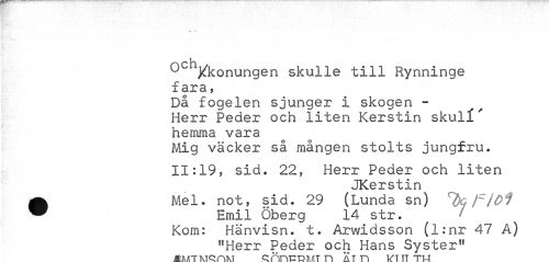 //// T ** //// Oc*Vkonungen skulle till Rynninge fara, //// Då fogelen sjunger i skogen -Herr Peder och liten Kerstin skull' hemma vara //// Mig väcker så mången stolts jungfru. //// 11:19, sid. 22, Herr Peder och liten //// JKerstin //// A Mel. not, sid. 29 (Lunda sn) ^c/^JOl //// ^ Emil öberg 14 str. //// Kom: Hänvisn. t. Arwidsson (l:nr 47 A) //// "Herr Peder och Hans Syster" //// ÄHÄT^TOAM cmrriHT n A T n I/T IT TU ////