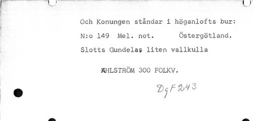 //// _ ^ A / //// Och Konungen ståndar i höganlofts bur: N:o 149 Mel. not. Östergötland. //// Slotts Gundela? liten vallkulla //// ÄHLSTRÖM 300 FOLKV. ////