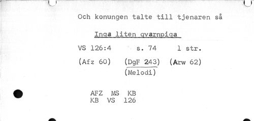 //// Och konungen talte till tjenaren så //// Inga liten qvarnpiga //// VS 126:4 s. 74 1 str. //// (Afz 60) (DgF 243) (Arw 62) //// (Melodi) //// A AFZ MS KB //// KB VS 126 ////