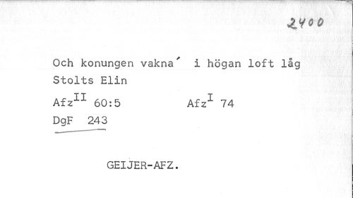 //// ^00 //// Och konungen vakna' i högan loft låg Stolts Elin //// Afz11 60:5 Afz1 74 //// DgF 243 //// GEIJER-AFZ. ////