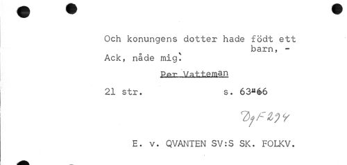 //// Och konungens dotter hade födt ett //// barn, - //// Ack, nåde mig^ //// P^T- Va+.tPman //// 21 str. s. 63ué6 //// E. v. QVANTEN SV:S SK. FOLKV. //// / ////