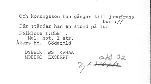 //// Och konungsson han gångar till jungfruns //// bur :// //// Där ståndar han en stund på lur \ //// Folklore I:Dbk 1. | //// Mel. not. 1 str. I //// Åkers hd. Södermld //// DYBECK MS KVHAA i //// MOBERG EXCERPT | ////