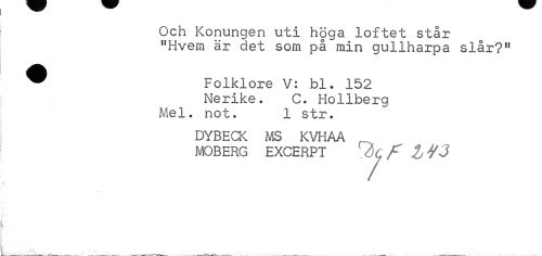 //// Och Konungen uti höga löftet står "Hvem är det som på min gullharpa slår?" //// ® Folklore V: bl. 152 //// Nerike. C. Hollberg Mel. not. 1 str. //// DYBECK MS KVHAA MOBERG EXCERPT f //// ? //// ) //// _ _ _ _ —__ ////