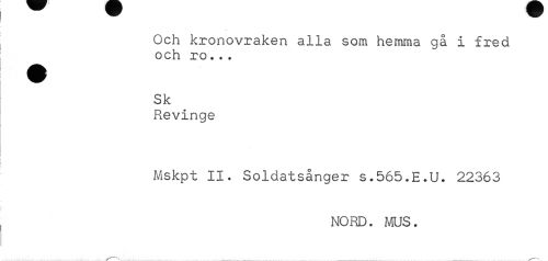 //// Och kronovraken alla som hemma gå i fred och ro... //// Sk //// xRevinge //// Mskpt II. Soldatsånger s.565.E.U. 22363 //// NORD. MUS. ////