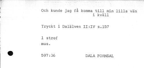 //// Och kunde jag få komma till min lilla vän //// i kväll //// Tryckt i Dalälven II:IV s.157 //// 1 strof mus. //// ® 597:36 DALA FORNSAL ////