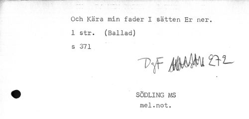 //// 4» # .. , //// Och Kära min fader I sätten Er ner. 1 str. (Ballad) s 371 //// Df JÄ //// \ //// * //// w SÖDLING MS //// mel.not. ////