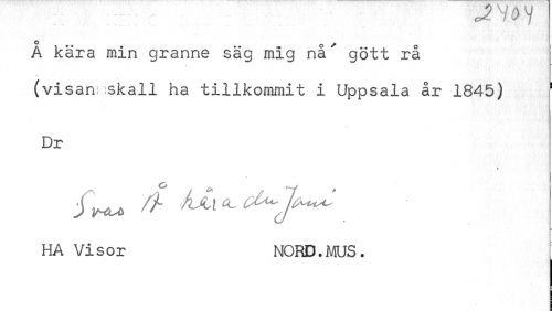 //// ---^ 7 ^ 7 //// A kära min granne säg mig nå' gött rå (visan) iskall ha tillkommit i Uppsala år 1845) //// Dr //// 9 //// j ^ fh axi d^j^ //// HA Visor NORD.MUS. ; ////
