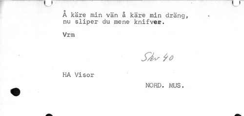 //// o //// A käre min vän a käre min dräng, nu sliper du mene knifve©. //// Vrm //// S^ 4 o //// HA Visor //// NORD. MUS. ////