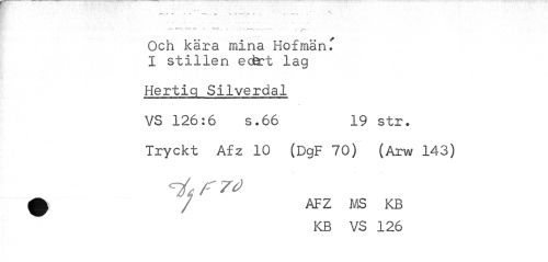 //// . T - ——. Mi ... 1 //// . I—...¦-•- ~— . ¦ •»¦«•. . . • //// Och kära mina Hofmän.' I stillen ecfct lag //// Hertig Silverdal //// VS 126:6 s.66 19 str. //// Tryckt Afz 10 (DgF 70) (Arw 143) //// A / AFZ MS KB //// KB VS 126 ////