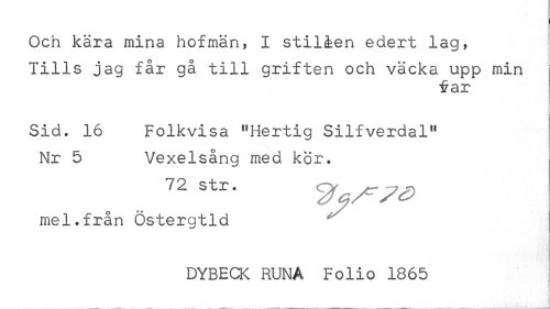 //// Och kära mina hofmän, I stilåen edert lag, //// Tills jag får gå till griften och väcka upp min //// far //// Sid. 16 Folkvisa "Hertig Silfverdal" //// Nr 5 Vexelsång med kör. //// 72 str- //// mel.från Östergtld //// DYBECK RUNA Folio 1865 ////