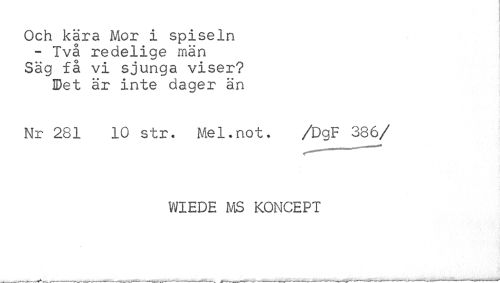 //// Och kära Mor i spiseln //// - Två redelige män Säg få vi sjunga viser? Det är inte dager än //// Nr 281 10 str. Mel.not. /DgF 386/ //// WIEDE MS KONCEPT //// >> . ___ ___ . ... ... _ ._. ___ .. _ . . .. ___—... ////