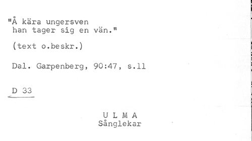 //// "Å kära ungersven han tager sig en vän." //// (text o.beskr.) ; //// ¦ //// i //// Dal. Garpenberg, 90:47, s.ll j //// D 33 //// U L M A Sånglekar ////