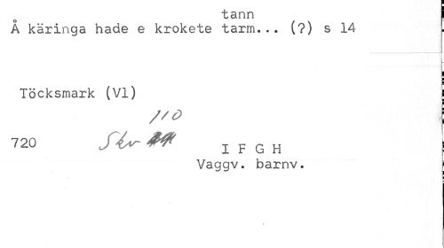 //// tann ! //// Å käringa hade e krokete tarm... (?) s 14 //// l //// Töcksmark (VI) \ //// // c> I //// 720 fl^ M I F G H I //// Vaggv. barnv. | //// t ////