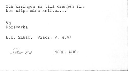 //// Och käringen sa till drängen sin, kom slipa mina knifvar... //// i //// Vg 1 //// Korsbert>a //// 1 //// E.U. 21810. Visor, V. s.47 //// S/Ctr- NORD . MUS. ////