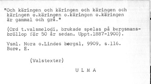 //// "Och käringen och käringen och käringen och käringen o.kärincjen o.käringen o.käringen är gammal och gra." 1 //// (Ord t.valsmelodi, brukade spelas på bergsmansbröllop för 50 år sedan. Uppt.1887-1900). //// Vsml. Nora o.Lindes bergsl, 9909, s.116. Bore, E. //// (Valstexter) //// U L M A ////