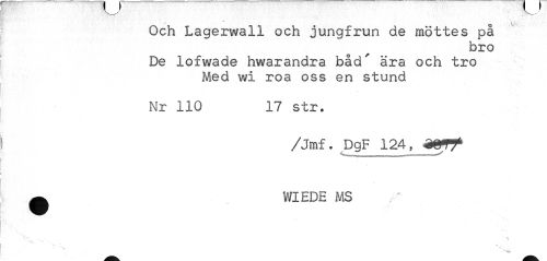 //// é //// ' ( //// Och Lagerwall och jungfrun de möttes på //// bro //// De lofwade hwarandra båd' ära och tro //// Med wi roa oss en stund //// Nr 110 17 str. //// /Jmf. DgF 124, ZMf //// ^ WIEDE MS //// • * -. 'v ' ////