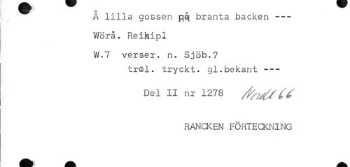 //// w //// A lilla gossen pq branta backen --- //// Wörå. Reihipl //// W.7 verser, n. Sjöb.? //// trål. tryckt, gl.bekant --- //// Del II nr 1278 /fatf {S //// RANCKEN FÖRTECKNING ////
