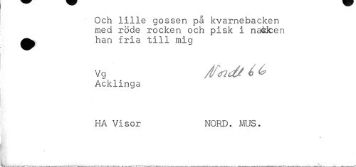 //// Och lille gossen på kvarnebacken med röde rocken och pisk i na&lcen ^^ han fria till mig //// Vg /ff<ndt Acklinga //// HA Visor NORD. MUS. //// » ////