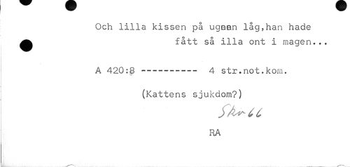 //// Och lilla kissen på ugnen låg,han hade ^ fått så illa ont i magen... //// A 420:8 --- 4 str.not.kom. //// (Kattens sjukdom?) //// fA^u //// RA ////