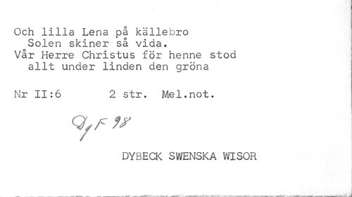 //// Och lilla Lena på källebro //// Solen skiner så vida. Vår Herre Christus för henne stod allt under linden den gröna //// Nr 11:6 2 str. Mel.not. //// DYBECK SWENSKA WISOR //// ^ <La\ .. . *m> d • - * a ->_ni- ¦ _ - - '. — — - - - LA__a^l^M ___¦ '' itlk .kil ////