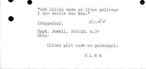 //// "Och lillan hade en liten gullvagn I den skulle hon åka." //// ^ (Vaggvisa). /V(/lMé> //// Uppl. Jumkil, 303:22, s.37 Grip. //// (Liten pilt hade en guldvagn). //// U L M A ////