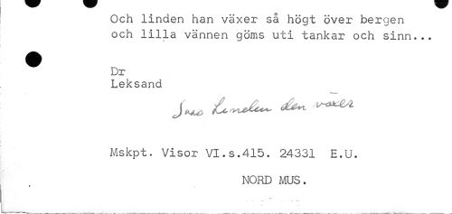 //// Och linden han växer så högt över bergen och lilla vännen göms uti tankar och sinn... //// ^ Dr //// Leksand //// Mskpt. Visor VI.s.415. 24331 E.U. //// NORD MUS. //// > ////