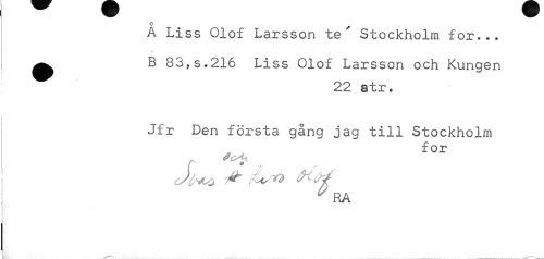 //// o A //// A Liss Olof Larsson te Stockholm for... //// w. //// ^^ B 83, s.216 Liss Olof Larsson och Kungen //// 22 atr. //// Jfr Den första gång jag till Stockholm //// for //// " RA ////