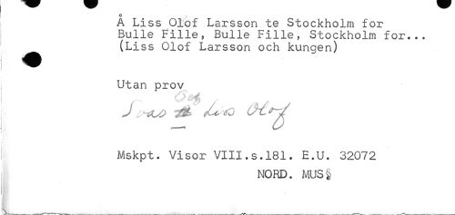//// o //// A Liss Olof Larsson te Stockholm for Bulle Fille, Bulle Fille, Stockholm for... ^^ (Liss Olof Larsson och kungen) //// Utan prov //// G<Sé , //// J i^uo fiCc-äd //// Mskpt. Visor VIII.s.181. E.U. 32072 //// NORD. MUS § ////