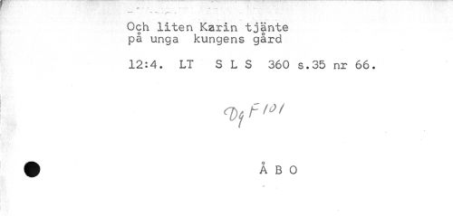 //// --~ T*. f* • t ' //// Och liten Karin tjänte på unga kungens gård //// 12:4. LT SLS 360 s.35 nr 66. //// <J)6 F fÖ t //// 1". ////
