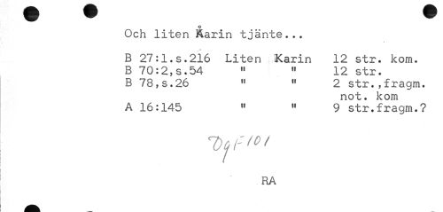 //// o //// Och liten Rarin tjänte... //// B 27:l.s.216 Liten Karin 12 str. kom. B 70:2,s.54 « « 12 str. //// B 78,s.26 " « 2 str.,fragm. //// not. kom //// A 16:145 " " 9 str.fragm.? //// RA ////